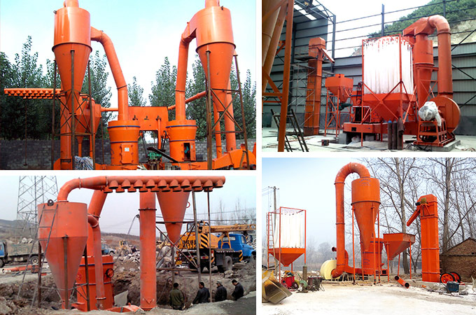 大块物料经破碎后由提升机送入储料仓,再由电磁振动给料机均匀地送入主机研磨室,进入磨室的物料被铲刀铲起,进入磨辊与环之间被碾压搓碎,风机将风吹入磨室内,吹起粉末带入分析机内,进行分选,达不到细度的又落研磨室重磨,合格细粉则随气流进入成品旋风集粉器,细粉与空气分离后从卸料口排出即为成品,而空气从上端回风管返回风机内,风路是循环的,并且是在负压状态下流动。